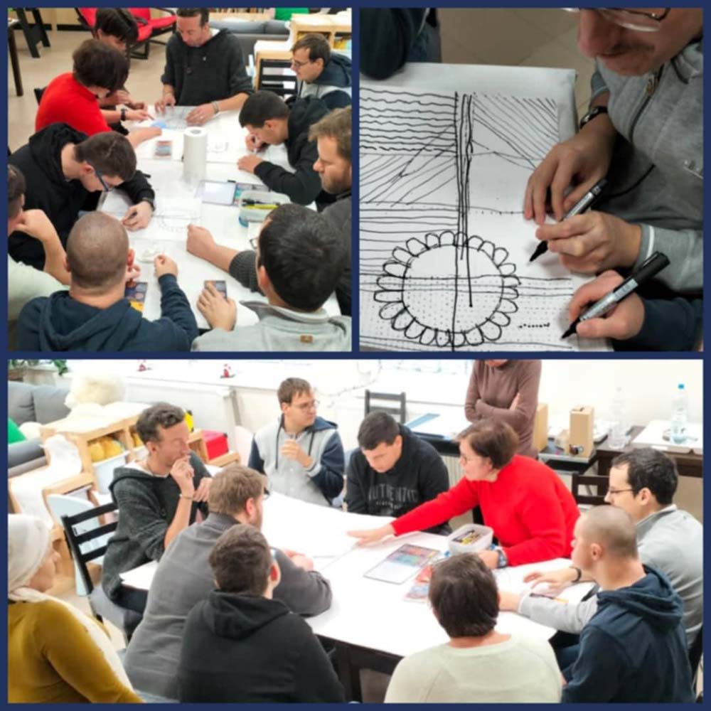 Kik ők? 11 fő, 23 és 49 év közötti, értelmi fogyatékossággal élő fiatalok. Vannak köztük, akik nagyon tehetségesen rajzolnak, vannak akik pedig más kézműves tevékenységben tudnak résztvenni, vannak ügyesebbek, és vannak kevésbé ügyesek. A közös azonban, hogy valamennyien részt vesznek a termékek előállításában, akár aktívan, akár csak egy részmozzanattal, akár csak azzal, hogy az eszközök előkészítésében, és elpakolásában segítenek többet.